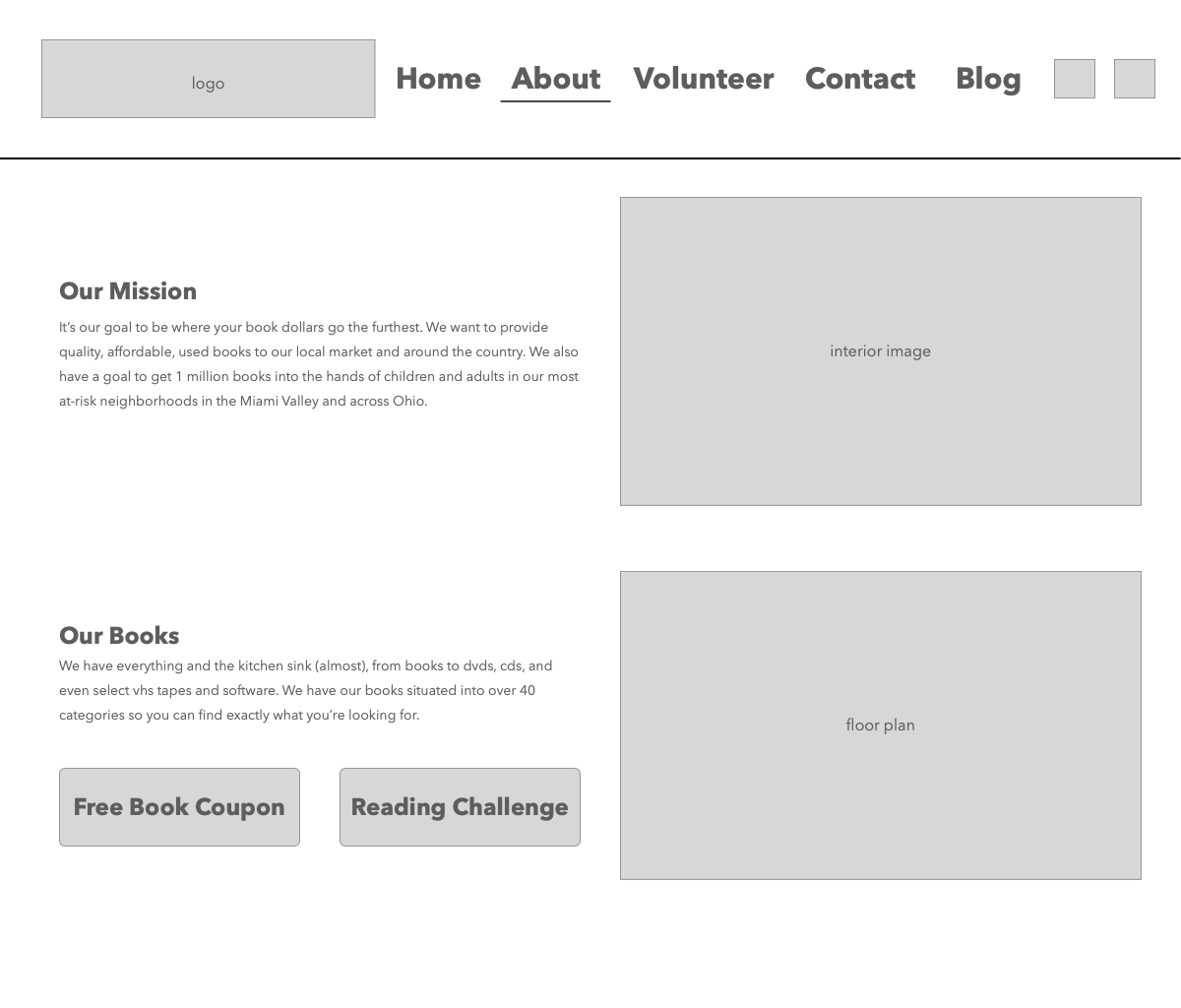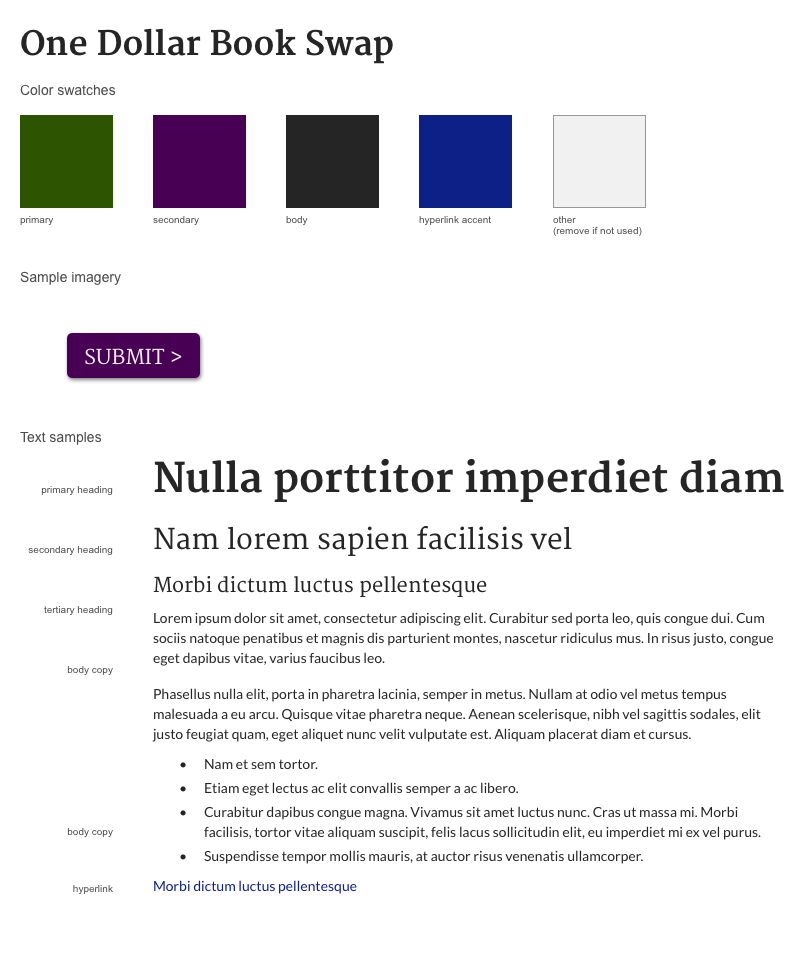 I created two separate style tiles, each exploring a slightly different visual direction for the site. The first is based off of the colors in their logo and uses contemporary fonts. The second uses sim- ilar fonts, but I explored a different direction for colors. I chose a deep, royal green to play off the idea of saving money by going to this bookstore, then I found complementary jewel tones for the secondary and hyperlink colors.